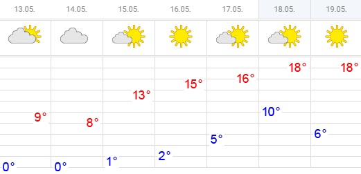 Во вторник через республику будет проходить тёплый атмосферный фронт. Но связанное с ним потепление придёт только в середине недели. В среду и четверг воздух прогреется до 13-18 градусов. Погода в эти дни будет солнечной, со слабым ветром. 15 мая наш регион окажется в центре области высокого давления. Стрелки барометров поднимутся выше отметки 755 миллиметров ртутного столба.