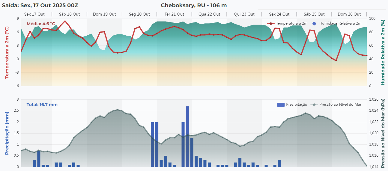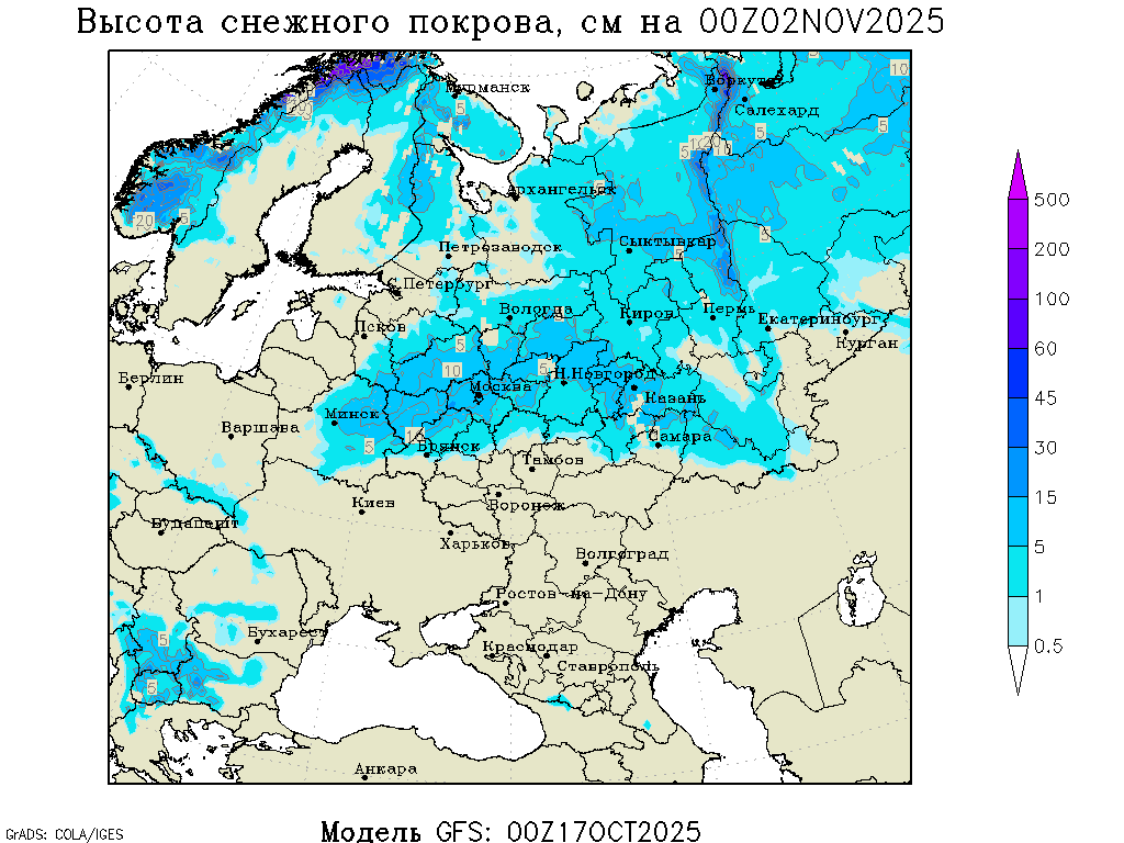 По расчётам численной модели GFS, в ближайшие 10 дней в Чебоксарах может выпасть 17 мм осадков — это примерно 30 процентов месячной нормы. Среднесуточная температура воздуха останется ниже отметки плюс 5 градусов. А первый настоящий снегопад с установлением снежного покрова высотой до 5 сантиметров ожидается 1-2 ноября.