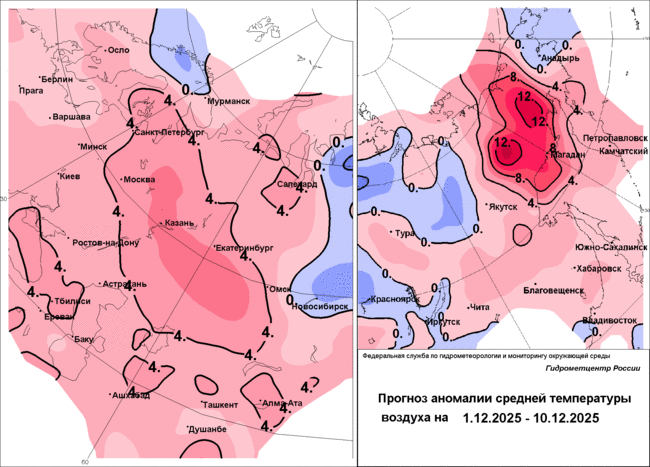 В конце недели антициклон получит подпитку холодного воздуха. На стыке южной и северной воздушных масс возникнет холодный фронт, который принесёт с собой осадки в виде мокрого снега. В Чувашии они пройдут с 5 по 8 декабря. В результате должен сформироваться небольшой снежный покров, который скорее всего, уже не растает, поскольку примерно в эти же дни среднесуточная температура воздуха станет ниже ноля градусов.