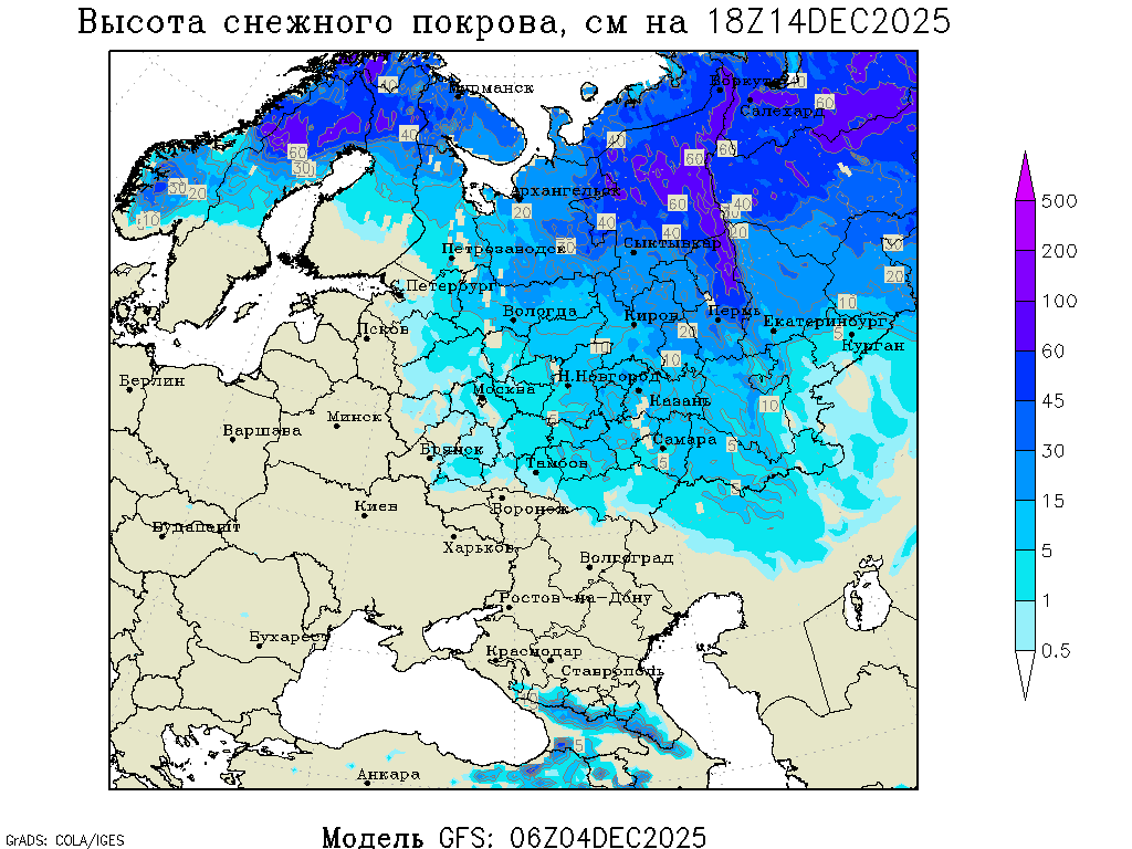 Наиболее сильными они будут в выходные 13-14 декабря. По расчётам численной модели GFS, в эти дни снежный покров по республике достигнет высоты от 5 до 10 сантиметров. Ну, а дальше нас ждёт ещё одно, более существенное похолодание, о которым мы расскажем в наших следующих обзорах.